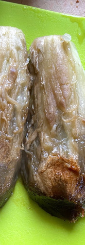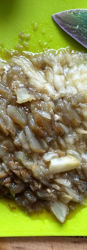 Po upečení jsem lilky rozkrojil na půl a nechal chvíli vychladnout. Pak jsem odstranil slupku (pokud nejde slupka stáhnout, vydlabejte je lžící), rozkrájel úplně najemno (klidně všechno naházejte do mixéru, pomazánka pak bude jemnější, já jí tentokrát udělal rustikálnější).