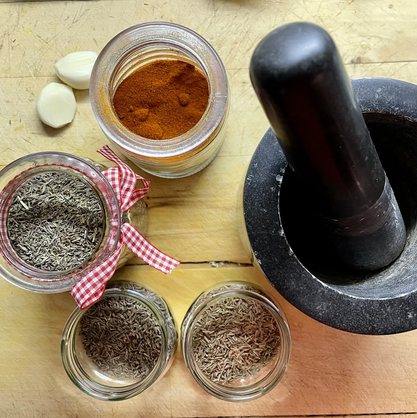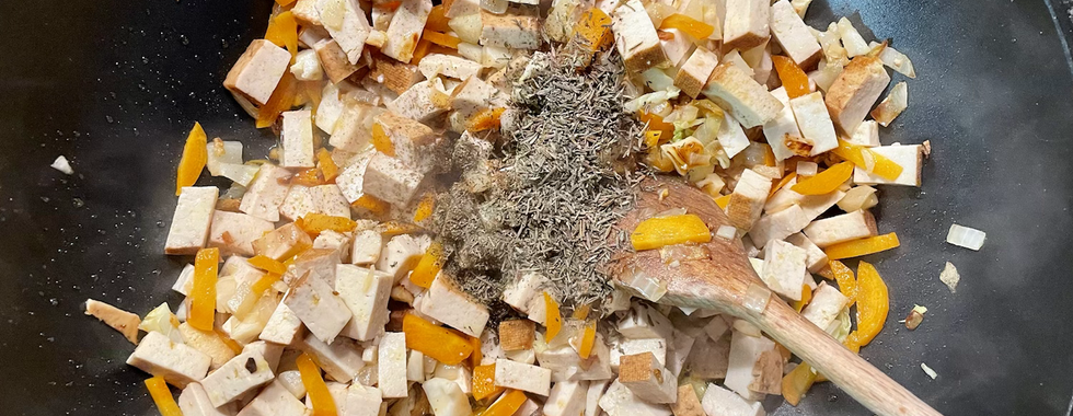 Mezitím jsem pokrájel tofu na kostičky, kapustu na menší kousky a v hmoždíři roztloukl oba kmíny a tymián.