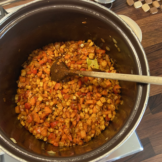 Když vše přišlo k varu, nechal jsem zeleninu změknout (zhruba deset minut) a přidal jsem do polévky fazole, kukuřici, tofu, pokrájené feferonky, rozmělněné zbylé dva stroužky česneku a nechal dál vařit.