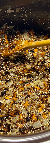 Po zhruba deseti minutách jsem přidal hrst pokrájených sušených rajčat (suchých, koupených v sáčku), 3 hrnky (asi 250 g v syrovém stavu / půl sáčku) bílých uvařených fazolí. Po chvilce do hrnce následovalo komplet koření, pohanka a quinoa. Všechno jsem ještě pár minutek opékal a jako vždy. jakmile se malinko něco z ingrediencí začalo přichytávat, vrznul jsem tam plechovku rajčat (kupuju většinou už krájené) a dva hrnky vody.